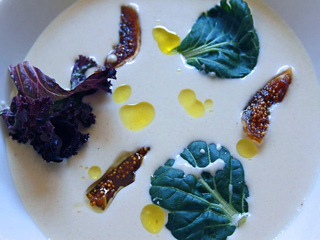 I prefer the traditional version as served in Málaga garnished with fresh white grapes, but I give the broth a boost by adding the grapes as a puree, and garnished with fig to keep the Moorish connection in evidence.