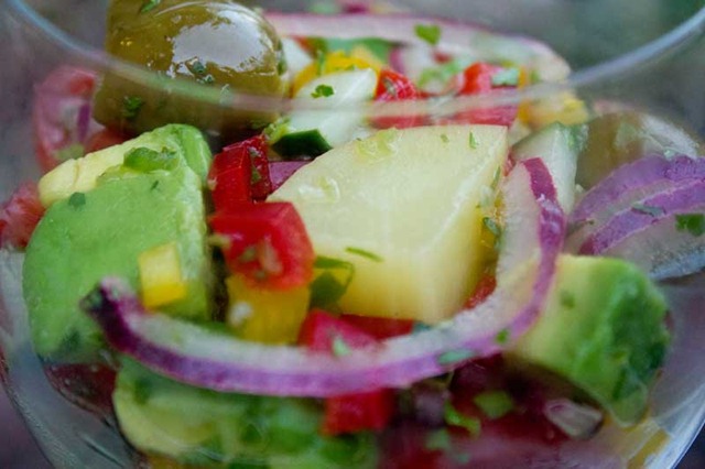 This is not ceviche because it doesn’t have the briny taste of the sea or the soft, meaty, succulence of shrimp or scallops. With olives, cumin and cucumber think Mexico meets Morocco, an oasis in a parched desert.