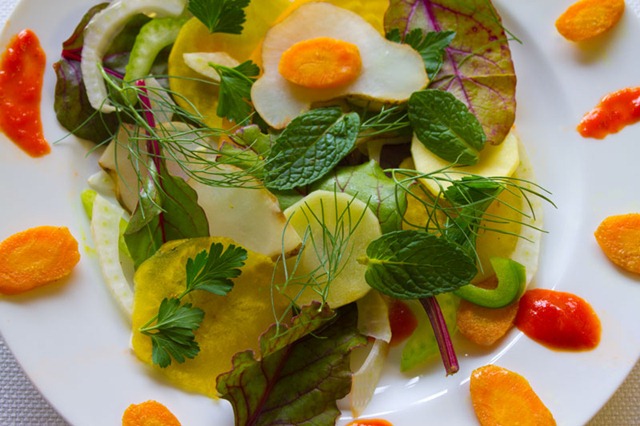 The salad consists of fresh fennel, celery, parsnips, yellow beets, curried carrots, Jerusalem artichokes, mint, and parsley, all of which share the anise flavor. I threw in some green and yellow bell pepper, cucumbers, baby beet greens, and red pepper puree for color and contrast.