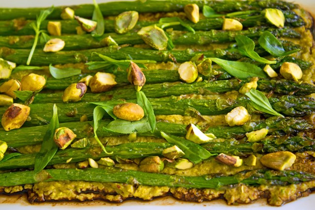 Since its still the season for fresh asparagus and I’m running out of ways to serve it, I adapted this recipe from Herbivoracious. Tweeks to the original? I like thin spears slightly undercooked and wanted a lighter purée, so I broiled instead of roasted and added more water to the purée.