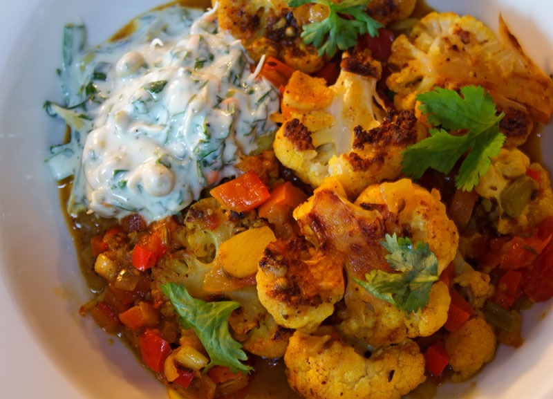 Serve cauliflower in wide soup plates with raita in a side dish.