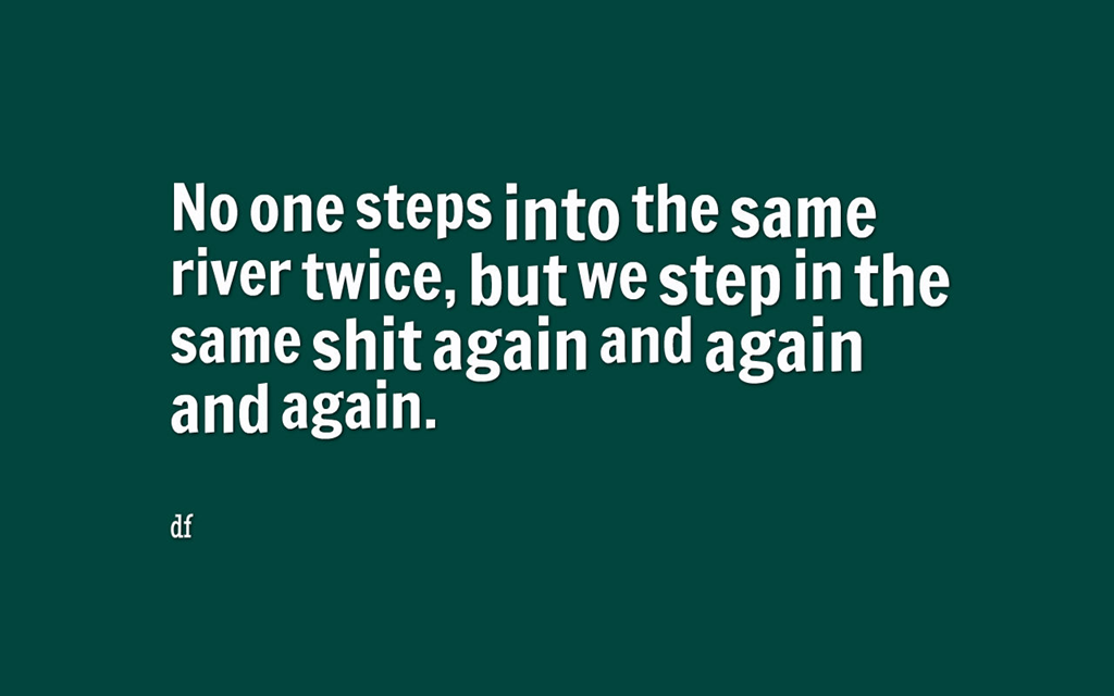 Questioning Heraclitus October 12, 2016 Dwight Furrow Aphorisms Leave a comment Share this: Click to share on X (Opens in new window) X Click to share on Facebook (Opens in new window) Facebook Click to share on Reddit (Opens in new window) Reddit Click to share on Tumblr (Opens in new window) Tumblr Click to share on LinkedIn (Opens in new window) LinkedIn Like Loading... Related