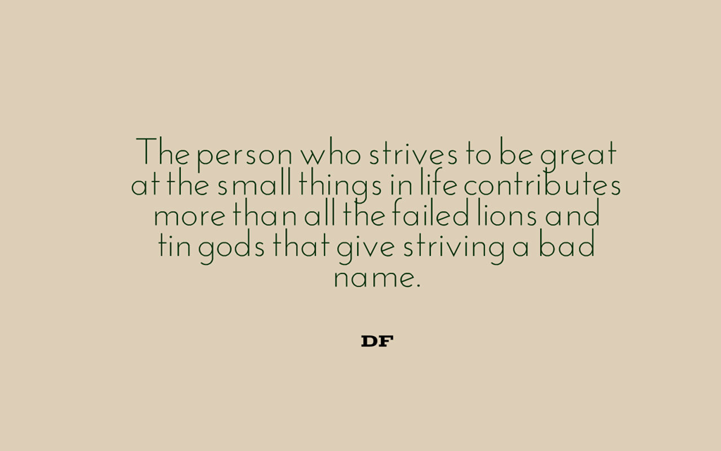 Little Things December 13, 2016 Dwight Furrow Aphorisms Leave a comment Share this: Click to share on X (Opens in new window) X Click to share on Facebook (Opens in new window) Facebook Click to share on Reddit (Opens in new window) Reddit Click to share on Tumblr (Opens in new window) Tumblr Click to share on LinkedIn (Opens in new window) LinkedIn Like Loading... Related