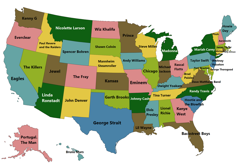 Some diligent soul compiled a list of the best selling artist born in each state of the U.S. Minnesota, California, Arizona, Virginia and some others, nice work.