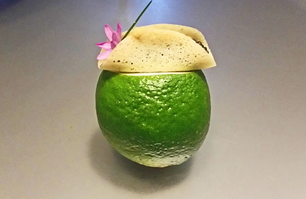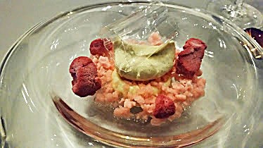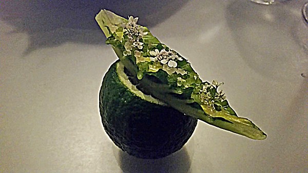 Two amuse buches led off the proceedings. The first was a spear of romaine lettuce filled with avocado and garlic flowers, the second a banana pancake perched on a lime and filled with Osetra caviar. The contrast between the aggressive spear and the soft, comforting avocado had some emotional resonance. The caviar and pancake was paired with a textured, bready Bollinger Brut Rose Champagne—the only emotion it evoked was pure delight at the classic, perfect pairing.