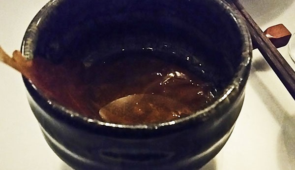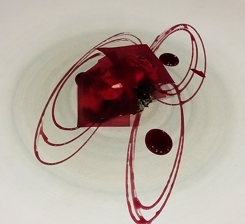 The first main course was one of the highlights of the evening. A rich, unctuous, umami-infused seafood and caramelized tomato broth was poured into a bowl containing a gelatin sheet of langoustine that formed a noodle when hydrated and then slowly melted into the broth. Called bouillabaisse on the menu, this bold, intensely flavored broth was accompanied by seaweed encrusted nori wrapped around a filling of creamy, spicy rouille, a chile and saffron sauce traditionally served with bouillabaisse in the the South of France. A melding of Asian and French flavors, the presentation was dark in color, the flavors deep and impenetrable like the sea, set off by the cheerful, encouraging rouille. This was paired with a Rouilly Premier Crus (Chardonnay) from a region in the south of Burgundy.