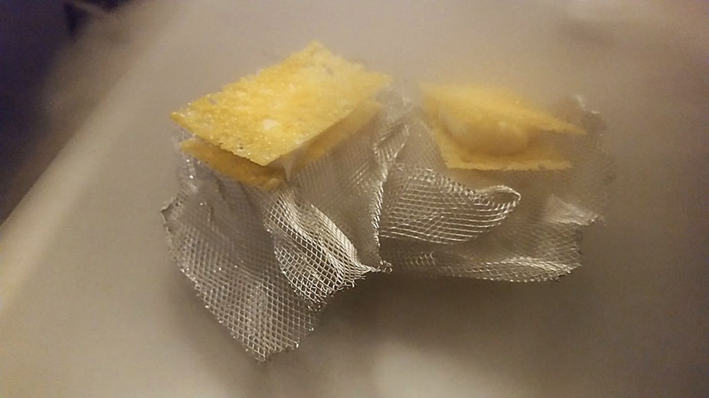 Finally, the only dish that survived from the earlier incarnation of Alinea was the grape-flavored balloon filled with helium that ends the meal. When eaten it does the helium thing to your voice. When I read about this years ago it sounded gimmicky—it was.