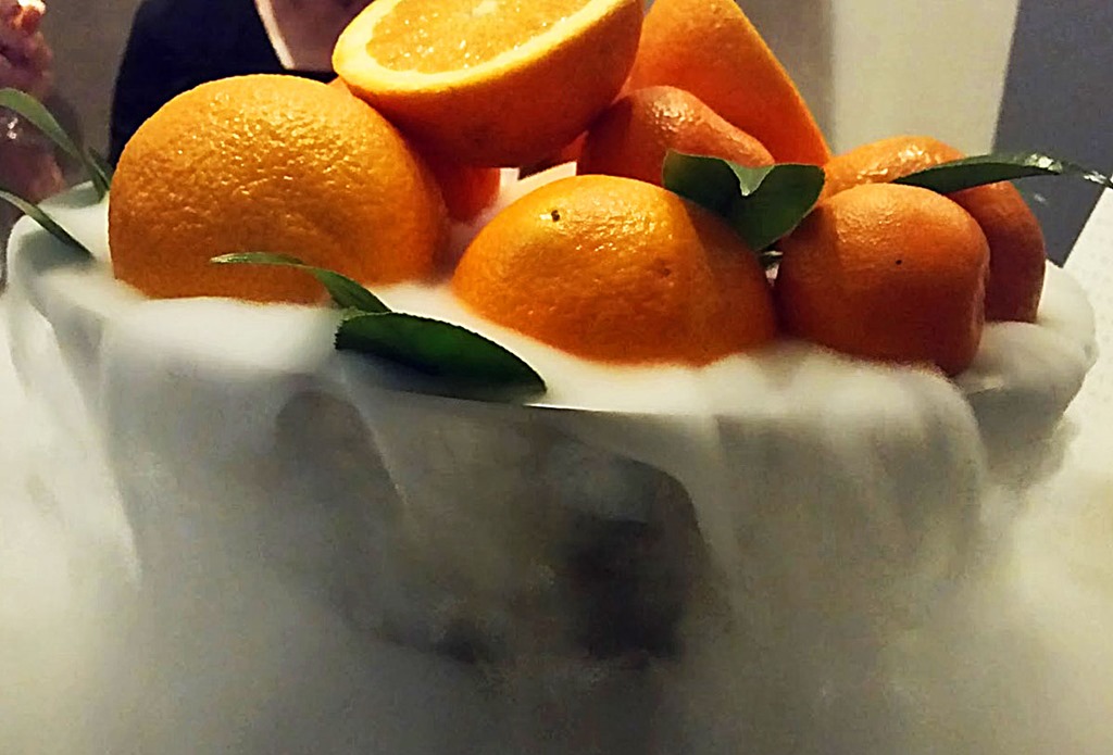 Next up was one of the reversals for which Achatz is famous. The dish is called Bocadillo which is the name of a Spanish sandwich often filled with jamon and cheese. In this case, the gossamer-like crisps forming the sandwich contained the flavors of jamon and cheese; the filling was essentially a viscous, liquid bread (pictured above). The large fruit basket in front of us was drizzled with liquid nitrogen, the “smoke” pouring forth laced with aromas of orange, mingling with a deconstructed gazpacho salad of heirloom tomatoes, frozen sherry and orange, marcona almonds and gooseberries (salad not pictured). As noted above, these are all traditional flavors commonly found together but radically transformed. It was paired with a Rhyme Vermentino from Carneros.