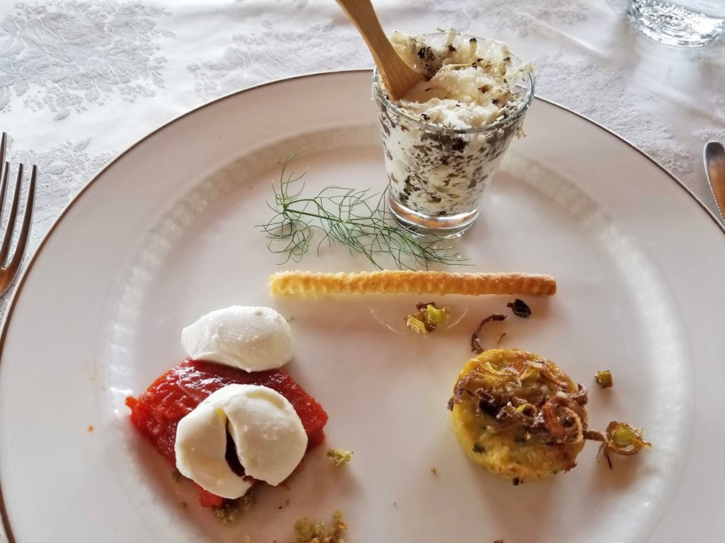 After departing Badia a Coltibuono we headed into the hills for lunch at Ristorante Le Contrade. This restaurant is in the middle-of-nowhere with sweeping views of the countryside. The lunch was this inventive trio of hot and trio of cold dishes—the star of the show was the “cappuccino” of frothy parmesan cheese topped with truffle, with runner up the boned quail stuffed with foie gras and lentils.
