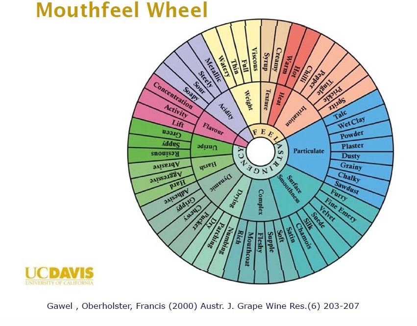Unfortunately, many fewer people have spent time studying the mouthfeel wheel, despite the fact that mouthfeel and texture are at least equal to if not more important than aromas in determining whether we will enjoy a wine or not.