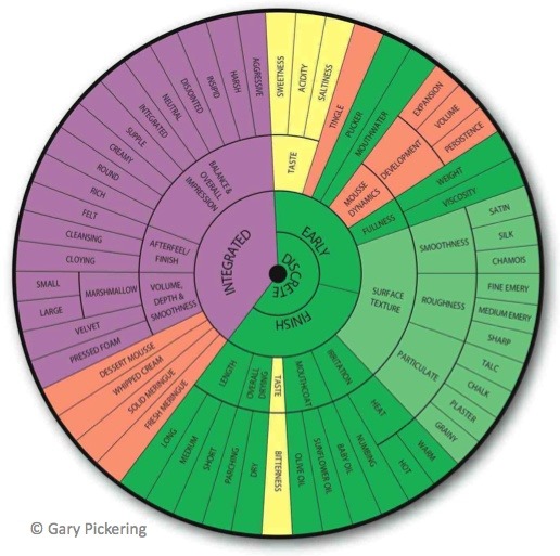 There have been several attempts to develop a mouthfeel wheel. The red wine wheel developed by Oberholster and Gawel (pictured above) and the white wine wheel developed by Pickering (pictured below) are both quite useful and deserve more careful study than they are typically given.